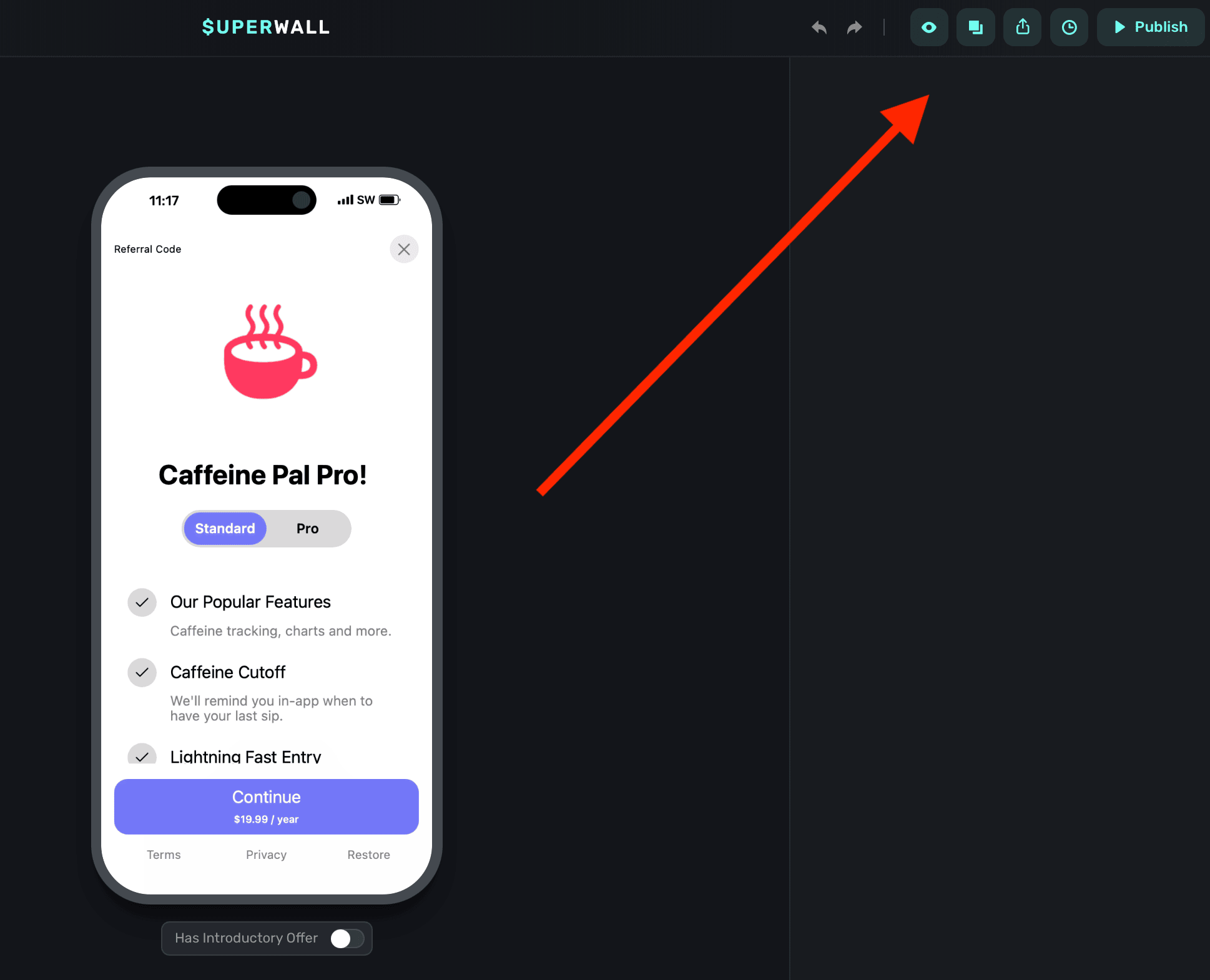 • Publish: Publish the current edits to your paywall and make them live.