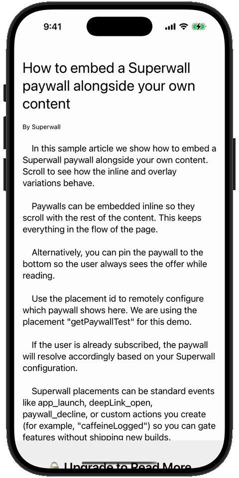Article-style paywalls let you keep readers in the flow of a long-form page while still prompting for upgrade options. You can place an inline paywall inside a scroll view, then present a second, full-screen paywall when users tap “see more plans.”