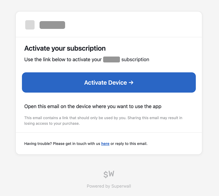 When using web checkout, customers receive an automated activation email from Superwall by default after checkout. It goes to the email entered at checkout, from Your app name <support+your-app-name@superwall.app>, with the subject Your activation link from your app name. This contains the redemption link that powers the web-to-app flow.